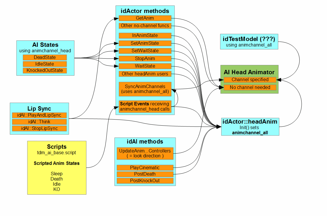 The reason those scripts are hard to interpret is that under the hood each AI is 2 animated entities: a body, which is the AI entity, and an attached head, which is an AF Attachment. I suspect you couldn't see blinking and talking using tdm_ai_showanimstate because it was showing you the head channel of the AI entity, instead of an animchannel on the head entity. Every animated entity, even something as simple as a waving flag, has the same 5 anim channels: ANIMCHANNEL_ALL ANIMCHANNEL_TORSO ANIMCHANNEL_LEGS ANIMCHANNEL_HEAD ANIMCHANNEL_EYELIDS Entities that have legs and torsos etc apparently map a set of joints to each channel. Not found that mapping yet but I read it on the wiki and it makes sense. Entities that don't have arms and legs, like flags, simply use ANIMCHANNEL_ALL for their animations, which affects all joints. When the scripts request an animation on ANIMCHANNEL_HEAD, *some* of the game functions treat that as a special case and they find the head that's attached to the AI and play the animation on that entity instead. But not necessarily all. Some might simply play it on the head channel of the body mesh, which would affect either nothing (if no joints are mapped to HEAD), or only the angle and position of the head. Either way they wouldn't affect the joints *in* the head. How did you want to start head animations? By implementing a rule that says, "if the head has a matching animation to what gets played on the torso, then play it on the head too?" Or something more flexible? in the meantime, I'll carry on mapping out the current set-up of any script that specifies ANIMCHANNEL_HEAD. |