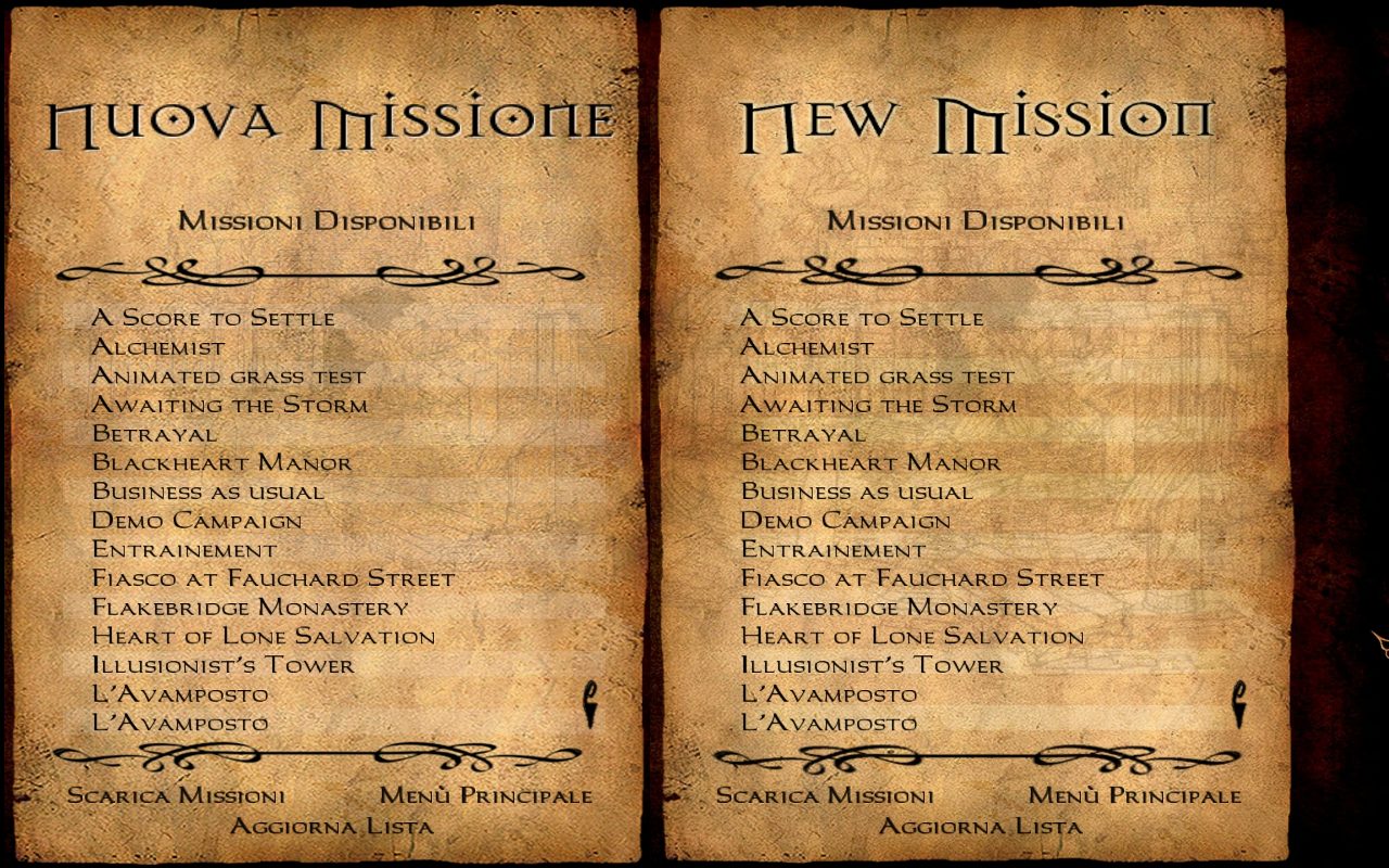 As a first step, the Mason font has been added, including patches so that the "S" in "Setting" is lowered to the baseline. Also a new GUI #define has been added (MENU_BACKGROUND), that sep. the background parchment, the watermark, and the ornamental lines above/under the content. The watermarks have been added as texture, too. In addition, a new define that uses that for the Settings and one for the New Mission page have been added, including the nec. strings, see attached image for reference. Missing are the Load - Save screen (that is bug 0002445) and the "Download" menu screen. Also, the shop might have a few Mason headlines. |