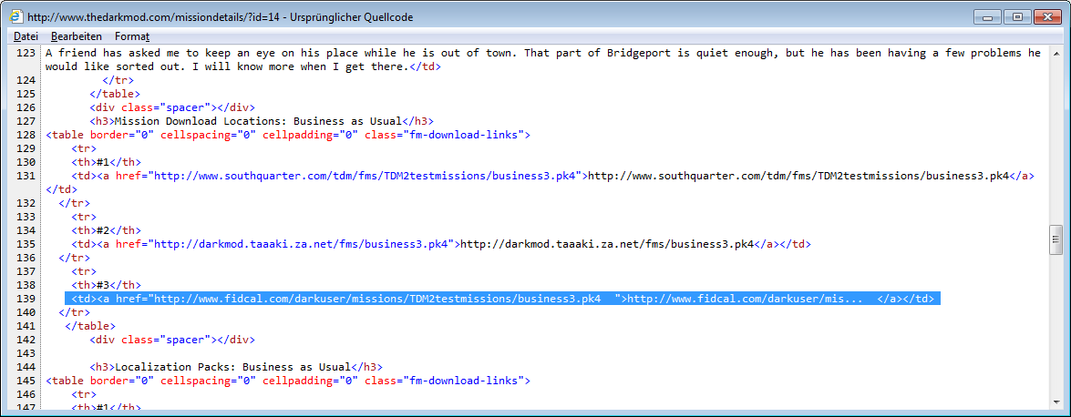 Some discussions on the blanks can be found here: http://forums.thedarkmod.com/topic/15254-tool-for-analyzing-mission-links-from-the-mission-list/page__view__findpost__p__329569 The best way to see the trailing blanks is to open the mission page with InternetExplorer and selecting 'View/Source' (Won't work with Firefox !) http://www.thedarkmod.com/missiondetails/?id=14 Here the relevant excerpt. Note that both the link and the description end with blanks (and sometimes there are also in links for other missions). (with some replaced characters in order to avoid this forum to mess with the html): [td][a href="http_//www.fidcal.com/darkuser/missions/TDM2testmissions/business3.pk4 "]http_//www.fidcal.com/darkuser/mis... [/a][/td] EDIT: I just attached a screenshot of the html source. And here a list of all links in the database affected by that issue: 'http://www.fidcal.com/darkuser/missions/TDM2testmissions/business3.pk4 ' 'http://darkmod.taaaki.za.net/fms/sound_alert_trainer.pk4 ' 'http://www.southquarter.com/tdm/fms/TDM2testmissions/thiefsden.pk4 ' 'http://www.fidcal.com/darkuser/missions/somewhere1_1.pk4 ' 'http://www.southquarter.com/tdm/fms/TDM2testmissions/siegeshop.pk4 ' 'http://www.southquarter.com/tdm/fms/TDM2testmissions/samhain.pk4 ' 'http://darkmod.taaaki.za.net/fms/solarescape1.pk4 ' 'http://www.fidcal.com/darkuser/missions/TDM2testmissions/oldhabits2.pk4 ' 'http://www.fidcal.com/darkuser/missions/timeofneed.pk4 ' |