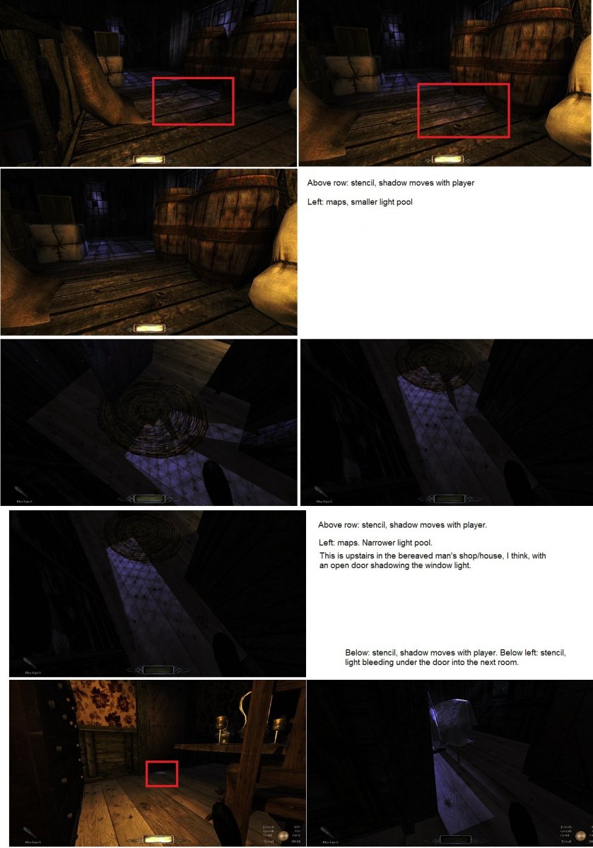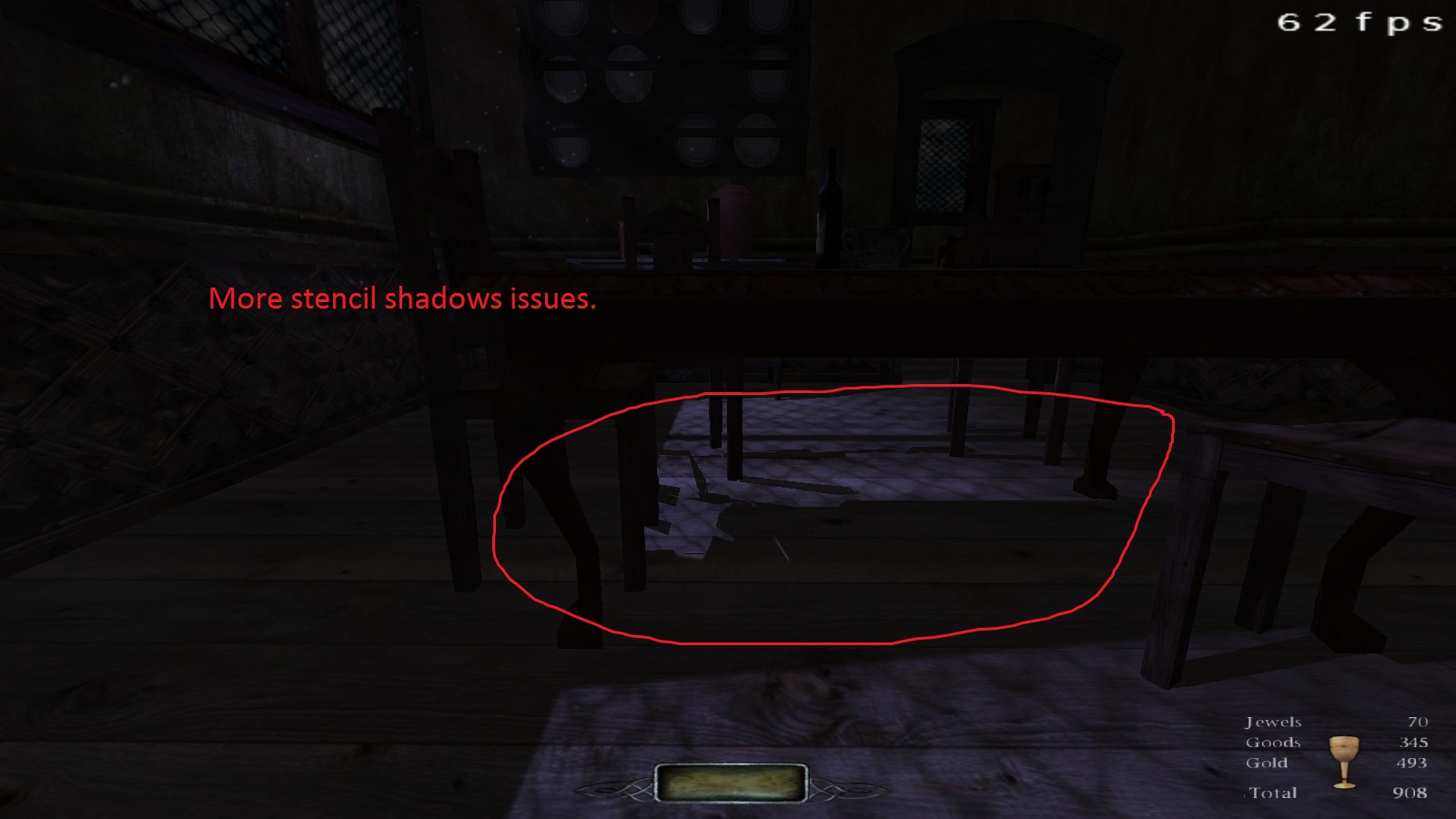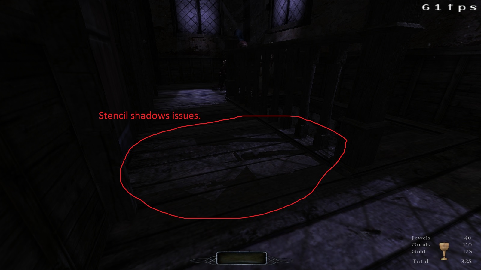 Perilous Refuge suffered heavily in beta from incorrect stencil shadows being cast by projected lights (not parallel lights, those weren't used). In the release build I disabled shadows on all projecting lights, but for this bug I've uploaded a modified FM with shadows re-enabled on those lights. https://drive.google.com/open?id=1cipp8rwvNOkasdsT4G-5ZEGZgHYbuGSB Many betatesters reported these shadow issues, and different testers had problems with different lights. Not all lights were affected. Look in the buildings for projected window lights. |