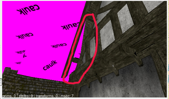 models/darkmod/architecture/modules/interior_mansion01/mansion01_window01.lwo has some missing polys. You can see the holes when looking down on the window. In the attached picture (window.jpg) the pink belongs to the caulked wall behind the window. |