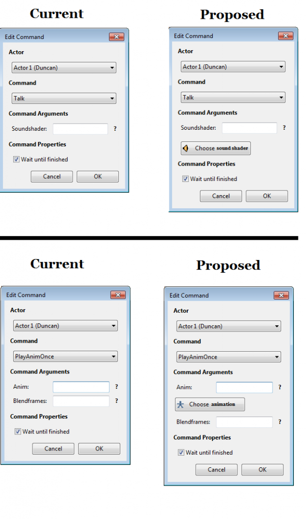 | Description | The Conversation Editor can be improved by allowing the mapper to access both sound shaders and animations whilst inside the editor. As it stands, one has to close the Conversation Editor down, manually track down either of the above elements, copy the shader/animation name, and only then return to the Conversation Editor to place the element in its correct place. The idea is that once you click either the "choose sound shader" or the "choose animation" button, you will be taken to the soundshader library or to the MD5 Animation Viewer - all without having to exit the Conversation Editor. Please see the attached image for how my proposed new GUI would look like. | ||||