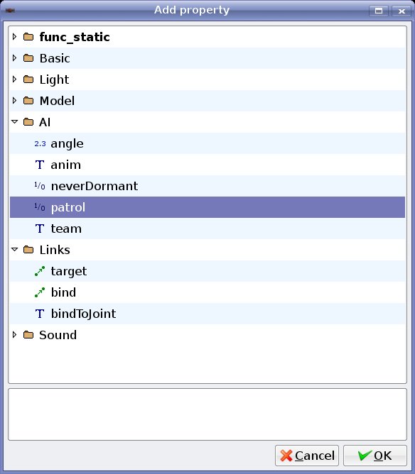 | Description | Some editor_var, editor_bool etc. definitions from the def files do not show up when you use "Add property": The attached screenshot shows that the help text for "patrol" for an AI is missing. Basically, descriptions only show up for the correct classname, but not for any other "class" that you can select in the same dialog. | ||||