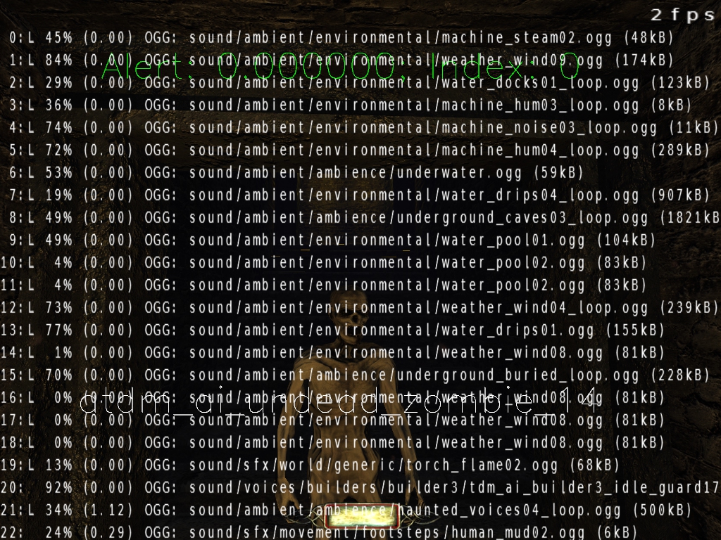 Added a screenshot with "com_showSoundDecoders 1" in NHAT 1 mission. As you see, there are tons of looped sounds, which simply stay indefinitely without being freed. In the shot, I am in the place where zombie lurks. Why is machine_noise sound still played? Shouldn't underground_caves sound already stop by that moment? Why is something like weather_wind present many times? |