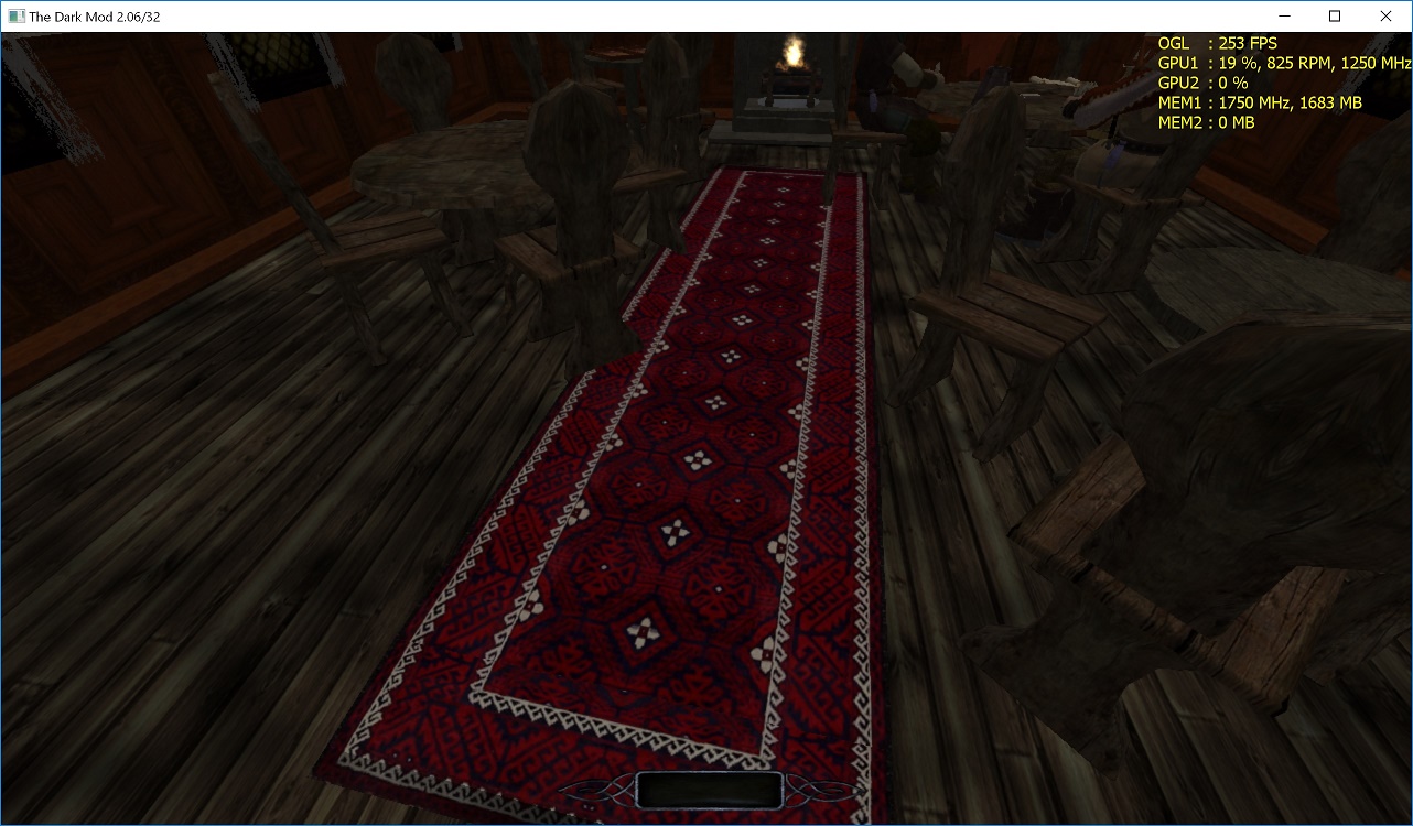 In the Inn Business case, the depth fight is between: func_static_199: consists of one quad patch with material "textures/darkmod/decals/dirt/scattered_dirt02" func_static_323: consists of one thin brush with upper side having material "textures/darkmod/carpet/runners/geometric01_red" The problem does happen in TDM 2.04 and later, and does not happen in TDM 2.03 and earlier. So this is caused by a careless fix during TDM 2.04 development. UPDATE: Broken by related issue 0004079. The values of r_offsetFactor/r_offsetUnits were changed from 0 / -600 to -2 / -0.1. Returning the old values back fixes the issue. I would say -600 and -0.1 are weird numbers here... Actually, the main difference is the addition of slope-based offset. |