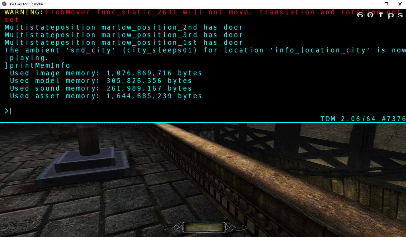 Here are the same stats for 1st mission of "No Honor Among Thieves" (takes 1 GB of virtual memory): Used image memory: 559,433,870 bytes Used model memory: 103,126,952 bytes Used sound memory: 175,558,812 bytes Used asset memory: 838,119,634 bytes As you see, it is less by 800 MB. So yes: the high usage comes from too many different textures used in the level, plus more different models and sounds. And it is explained by the sheer size of the map, not by any problem in the engine. The high memory usage by assets cannot be fixed because it is not a bug (and I think it is unlikely to be improved except for by mapper's efforts). One thing which will be improved in future is EAS (0004755). Aside from that, I recommend switching exclusively to 64-bit build if you create maps of this size. P.S. BTW, I have noted the printMemInfo command in two wiki pages: http://wiki.thedarkmod.com/index.php?title=Performance:_Essential_Must-Knows#Texture_Variety http://wiki.thedarkmod.com/index.php?title=Creating_Large_Areas#Possible_Errors |