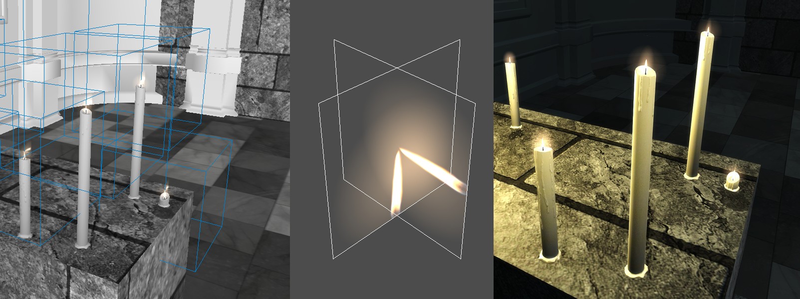 Sure, will do that in next day or two. Or, you can recreate it yourself, here's the particle setup: /* Generated by DarkRadiant's Particle Editor. */ particle do_flame_candle { { count 1 material textures/do/fx/candle_flame01 time 999.000 cycles 0.000 timeOffset 0.000 bunching 1.000 distribution rect 0.000 0.000 0.000 direction cone 90.000 orientation y speed "0.000" size "2.500" aspect "1.000" angle 90.000 rotation "0.000" randomDistribution 0 boundsExpansion 0.000 fadeIn 0.000 fadeOut 0.000 fadeIndex 0.000 color 1.000 1.000 1.000 0.000 fadeColor 0.000 0.000 0.000 0.000 offset 0.000 0.000 0.000 gravity 0.000 entityColor 1 } { count 1 material textures/do/fx/candle_flame01 time 999.000 cycles 0.000 timeOffset 0.000 bunching 1.000 distribution rect 0.000 0.000 0.000 direction cone 90.000 orientation x speed "0.000" size "2.500" aspect "1.000" angle 90.000 rotation "0.000" randomDistribution 0 boundsExpansion 0.000 fadeIn 0.000 fadeOut 0.000 fadeIndex 0.000 color 1.000 1.000 1.000 0.000 fadeColor 0.000 0.000 0.000 0.000 offset 0.000 0.000 0.000 gravity 0.000 entityColor 1 } } The texture image: https://s9.postimg.cc/5850fib1r/obraz.png (The image had to be rotated like that, as it the flame couldn't be positioned straight up. That might also be worth checking, but I checked stock TDM flame textures, and they use similar setup.) And finally the material definition: textures/do/fx/candle_flame01 { translucent noshadows twosided sort 20 { blend add map textures/do/fx/candle_flame01 } } |