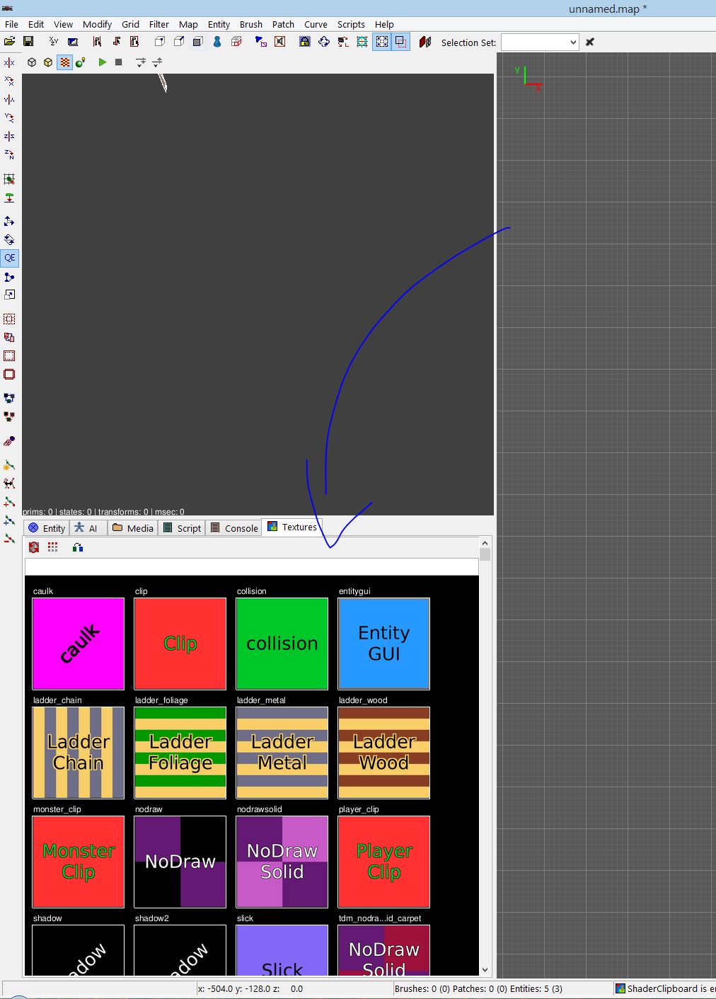 Thanks for the video - you've observed this correctly that materials not starting with "textures/" are considered "other materials" and they are hidden in the Textures tab. The code is doing that on purpose, I think it was doing that since even before we forked DarkRadiant off the original GtkRadiant. If you'd like that to be changed, I can problably add an option to show or hide these "other materials" in the Textures Tab. (But it should go to a different bugtracker entry, of course.) |