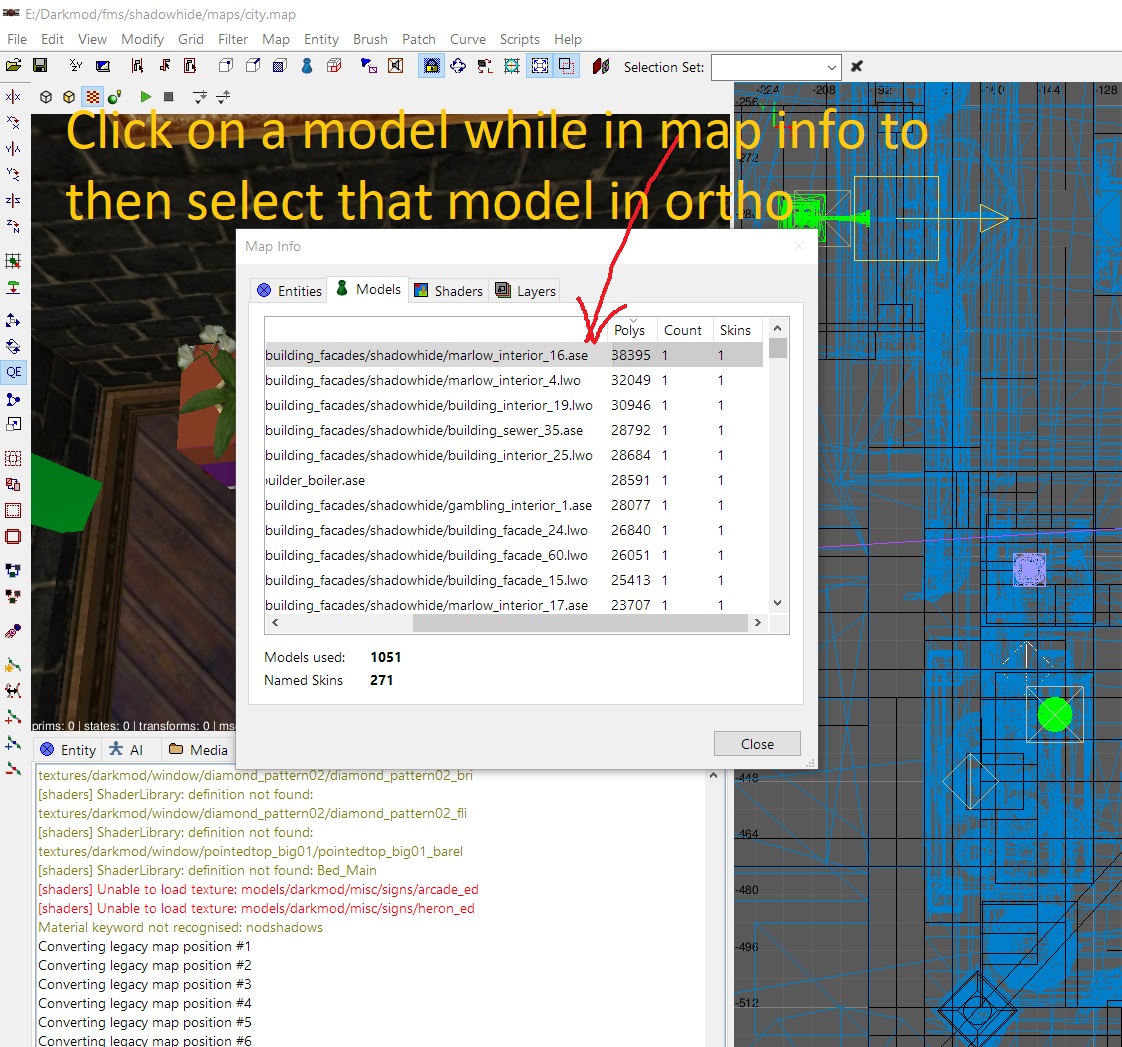 | Description | Feature request: When listing models in a map by poly count, click main menu>map>map info, then click on the models tab and then the polys column. Click on polys column to reorder from largest to smallest and then highlight/click-on a model from the list. (see attached) What would would useful is if doing the above action the model above is then selected in orthoview, the same what its shown in the Entity list inspector. | ||||