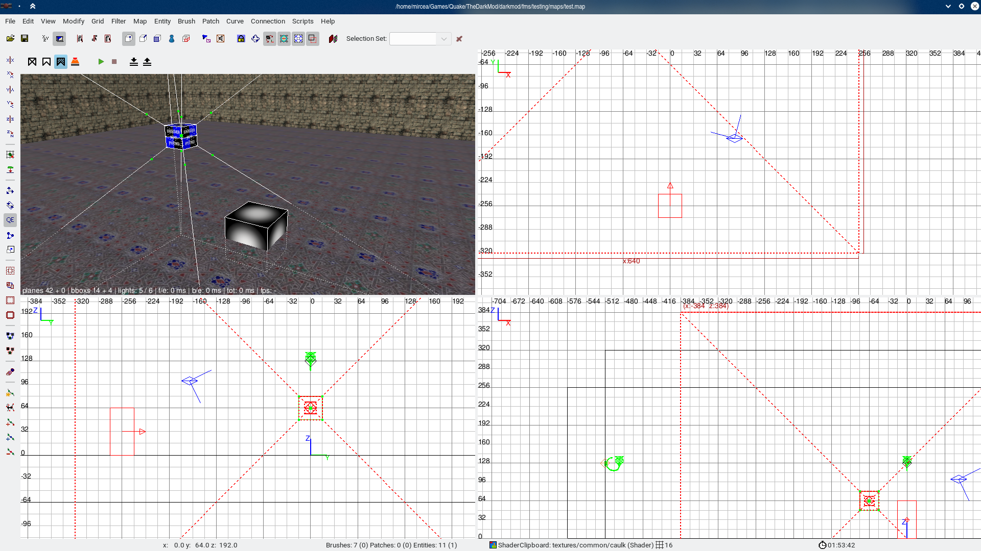 | Steps To Reproduce | Draw a bunch of brushes and / or patches. Select them all, right click in a 2D viewport, choose "convert to func_static". Now open the entity window with the N key, select the classname spawnarg, and modify it from "classname func_static" to "classname light". At first everything may appear normal. However the brushes will have slid in a seemingly random direction; If you reload the map or try dragging the entity to move it, you should see them snap to the side, also you'll be dragging the light entity while its geometry stays in place. Even worse, if you go into Select Vertices mode, you will see the vertices of the brushes in one location but its real geometry in another (see the attached screenshot showing this effect). | ||||