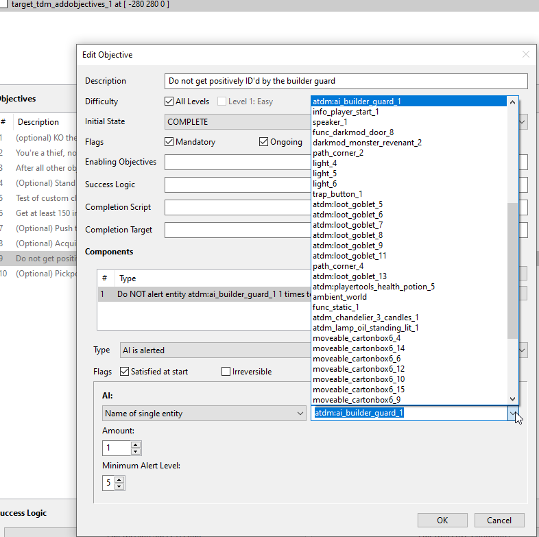 | Description | Associated with every objective component, when selected for editing, are typically additional text fields. Whenever such a text field is of field type of "Name of single entity", it would be desirable to make visible a button, "Select entity...", that if pressed would allow choosing the name from a list of pre-existing entities. Typically, there is room for this button above the text field and right-justified with it. Note greebo: I'll be going for adding a dropdown list to that text field, this is easier than a separate dialog. | ||||