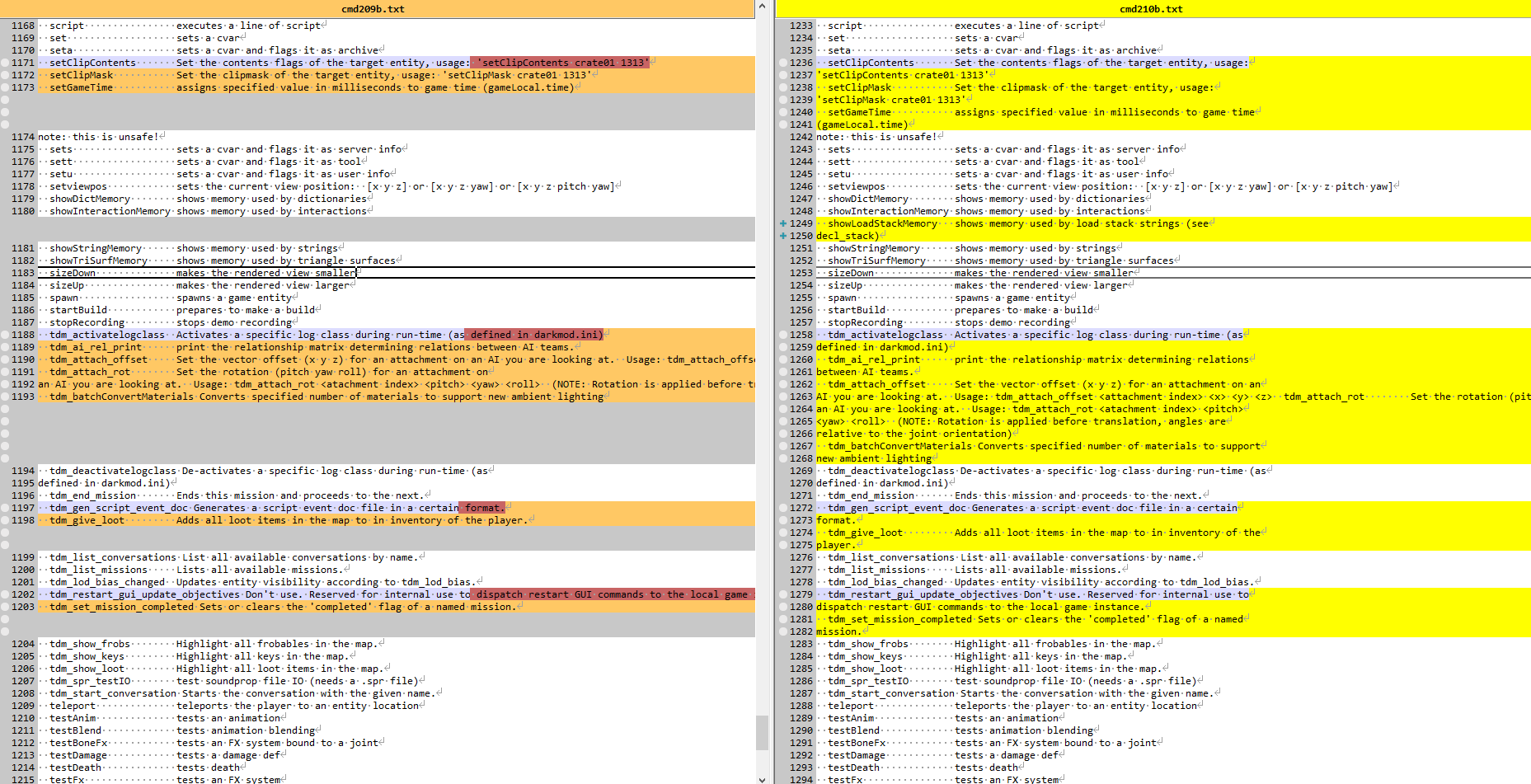 Attached the results on condumping the list of all cvars and cmds. Also attached image with diff comparison. cmd209b.txt (54,488 bytes)