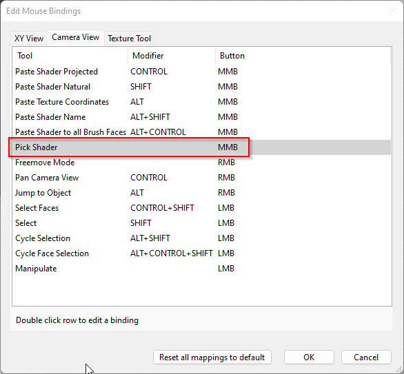 By default, we're talking about the Pick Shader command, in the Edit > Mouse Bindings... dialog. It should pick the texture when you click it in the camera view. |