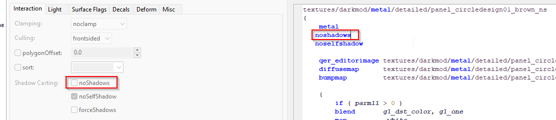 This appears to be a problem that is happening earlier, the noshadows checkbox is unchecked, e.g. for the material textures/darkmod/metal/detailed/panel_circledesign01_brown_ns |