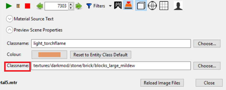 The only way to change the material used in the preview "room" can be changed by editing the doom3.game or darkmod.game files: <materialPreview> <defaultRoomMaterial value="textures/darkmod/stone/brick/blocks_brown" /> <defaultLightDef value="light_torchflame" /> </materialPreview> I assume you're hoping for an option to pick the material in the UI itself? |