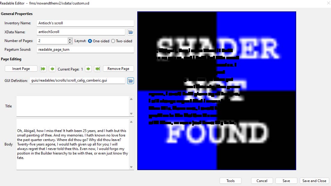 | Description | When I select a readable object and do the menu command Entity > Readable Editor, the dialog appears but the right hand side doesn't display the WYSIWYG view of the readable. Instead it displays "shader not found". Any text you add shows up on the WYSIWYG view, but barely readable. Note, the readable looks fine in the DarkMod, it's only DR that has the problem. | ||||