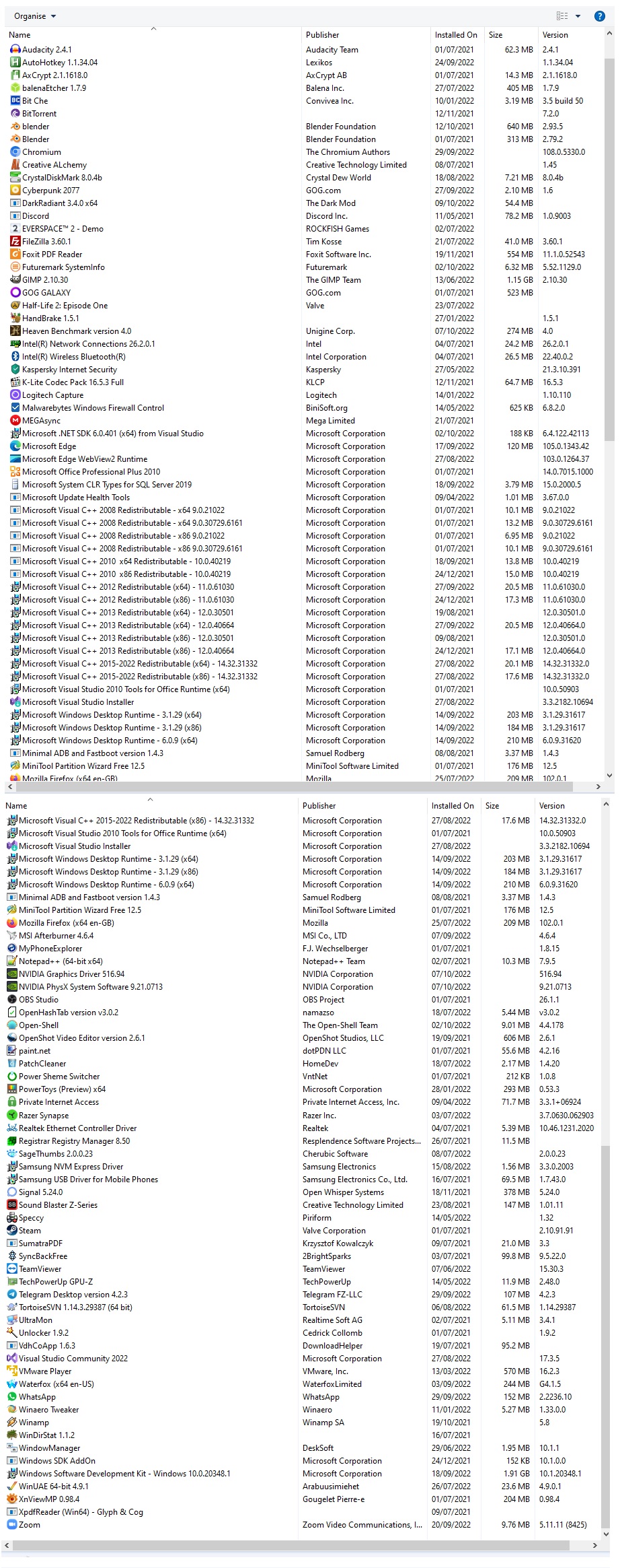 Regarding what programs I have installed that 'might' be causing an issue, I wouldnt know where to start (see attached). However I did install visual Studio and a bunch of asocciated application while do some testing for Stagatilov.
