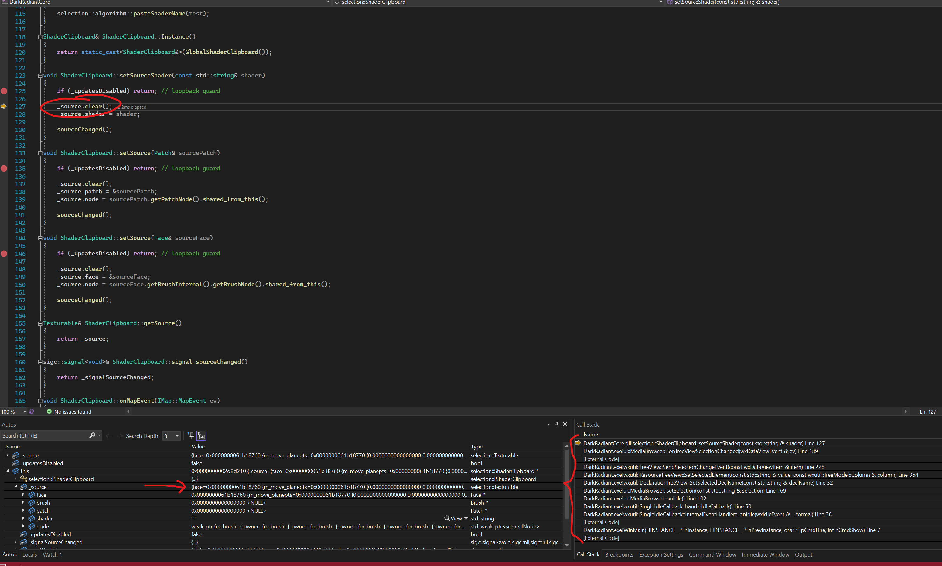 | Description | I mentioned this in the forums, but didn't raise a bug report right away because it's difficult to reproduce: https://forums.thedarkmod.com/index.php?/topic/21638-darkradiant-350-released/&do=findComment&comment=480055 It happens reliably, just 'after a while'. Restarting DR fixes it temporarily. So I compiled DR from source with debug, and have been working with it until the problem occurred. Then I attached the debugger and had a look. It looks like what's happening is when you select a brush face, the 'face' property of the _source property in ShaderClipboard.cpp is getting set correctly, but then cleared right after by some event from MediaBrowser.cpp. However, the 'shader' property is set by the same operation, so that gets used instead during the subsequent paste operation, and that's why I don't see the scale/position of the source face applied. NOTE: I realize that the clipboard gets cleared as soon as you do a copy - this is happening after that, and after the face gets correctly set in the clipboard. The thing that is triggering the clear operation is this: https://github.com/codereader/DarkRadiant/blob/6979f499f3e740aa2fc31ea09910439a614725bc/radiant/ui/mediabrowser/MediaBrowser.cpp#L189 I've included a screenshot of the debugger that shows _source about to be cleared, and the current stack. You can see that 'face' is populated before the clear() occurs. I think that's about all I'm able to figure out on my own - if there is anything else I can try to help debug this, let me know. | ||||