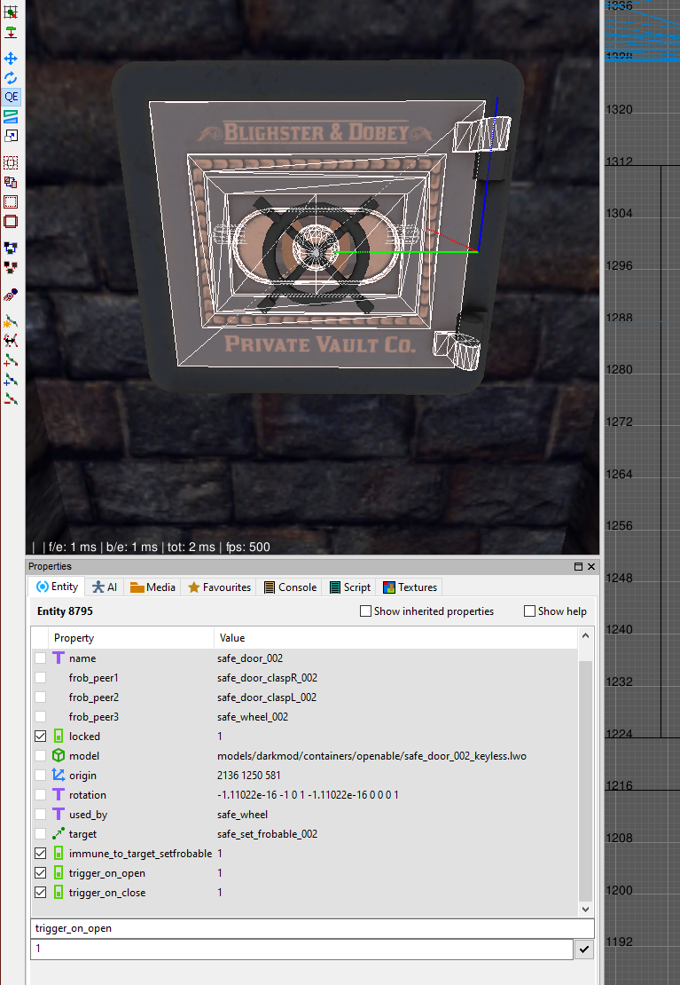| Description | - immune_to_target_setfrobable 1 - trigger_on_open 1 - trigger_on_close 1 All 4 safe prefabs using the following door models - models/darkmod/containers/openable/safe_door_001keyless.lwo - models/darkmod/containers/openable/safe_door_001.lwo - models/darkmod/containers/openable/safe_door_002keyless.lwo - models/darkmod/containers/openable/safe_door_002.lwo | ||||