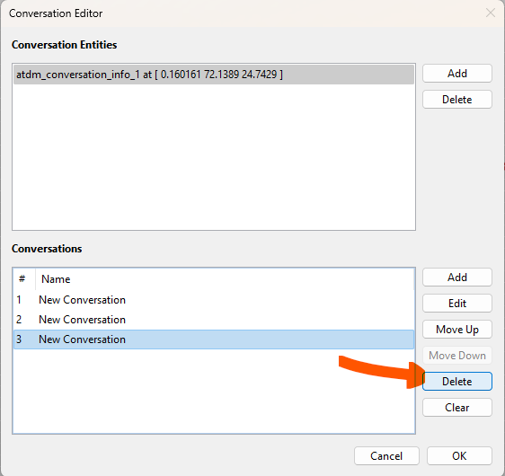 | Description | It appears there's no way to delete individual conversations via the conversation editor. The delete button will only remove the entire atdm_conversation_info entity with all of its conversations. | ||||