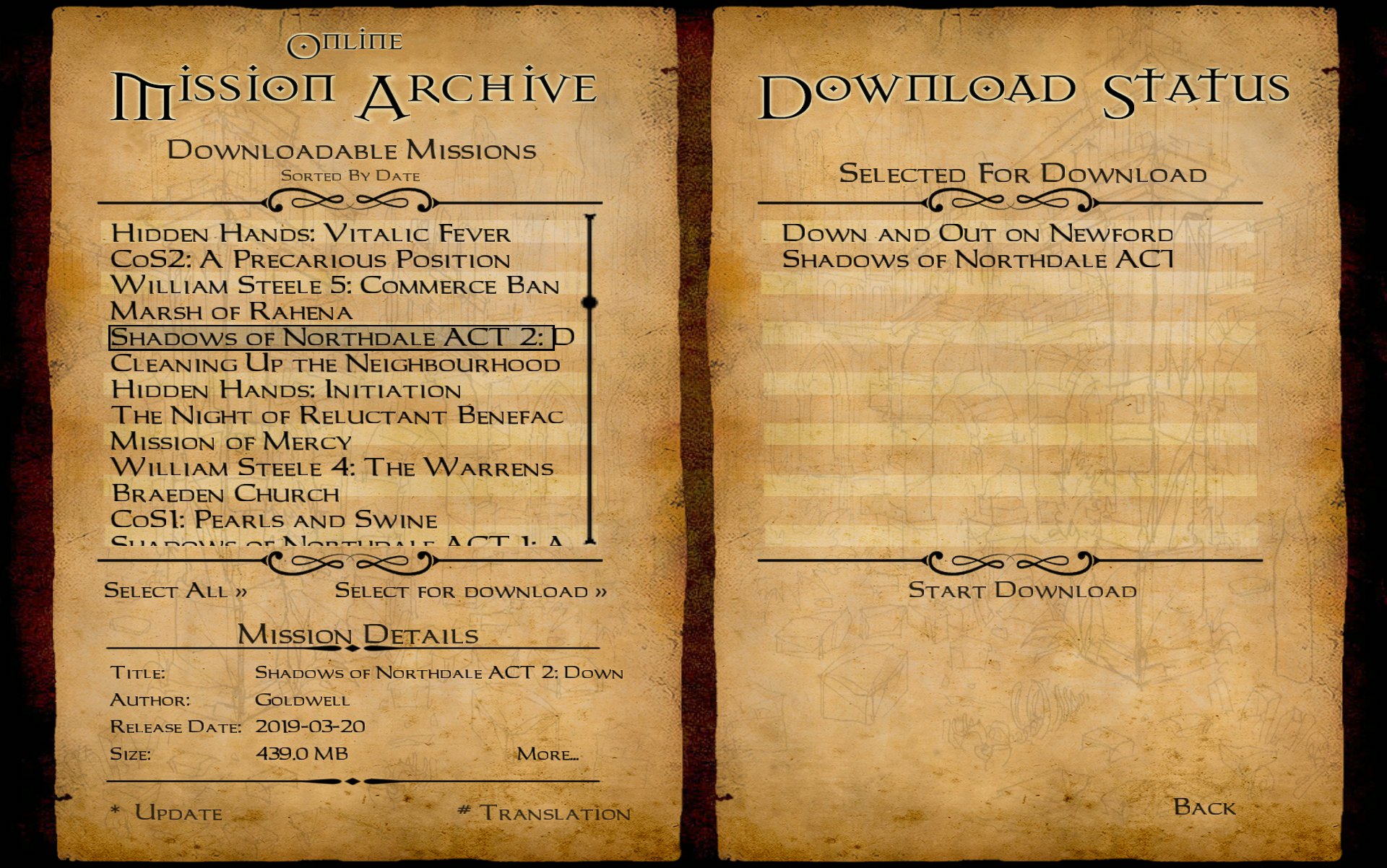 | Additional Information | Other issues to consider: * The mission downloader prefers screenshots in 800 x 600 resolution, last I checked. The screenshots box probably doesn't take up more than that on a 1080p computer screen, but probably looks blurry on higher resolutions. If we raise this we will probably have to use AI to upscale all our existing screenshots. * If a mission is selected for download it should in my opinion no longer be selectable or shown in the downloadable missions list. * We might also want to improve the quality of our menu and parchment textures. That's a wider issue though, and we might decide to transition to a parchment-free menu. | ||||